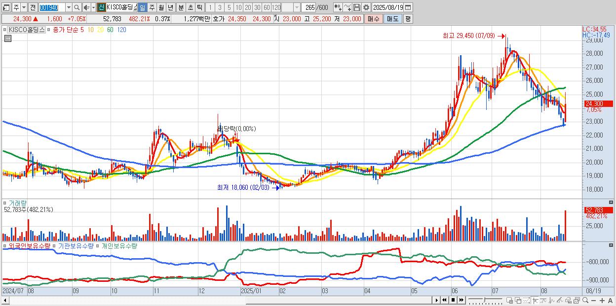 - KISCO홀딩스 (24,300원 ▲ 7.05% , 시총: 3,445억, 거래량: 52,783, 거래대금:13억)