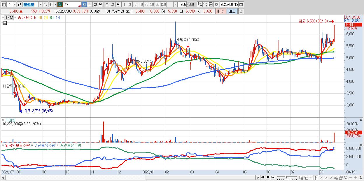 - TYM (6,200원 ▲ 9.73% , 시총: 2,793억, 거래량: 8,240,058, 거래대금:516억)