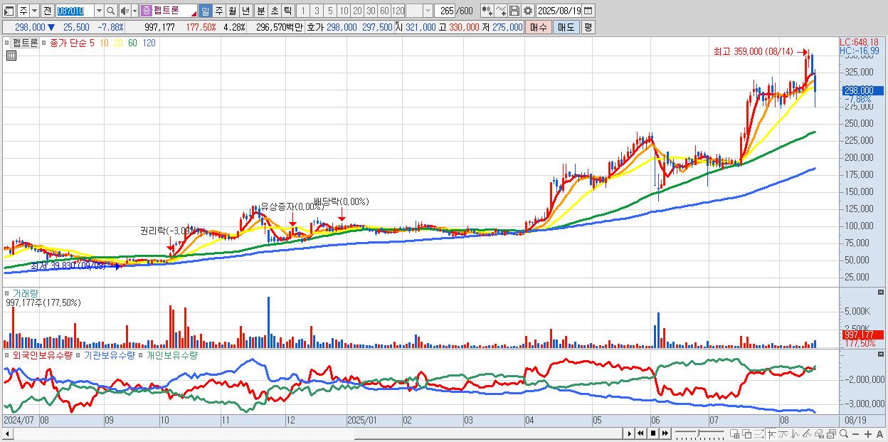 - 펩트론 (301,000원 ▼ -6.96% , 시총: 70,125억, 거래량: 614,255, 거래대금:1,822억)