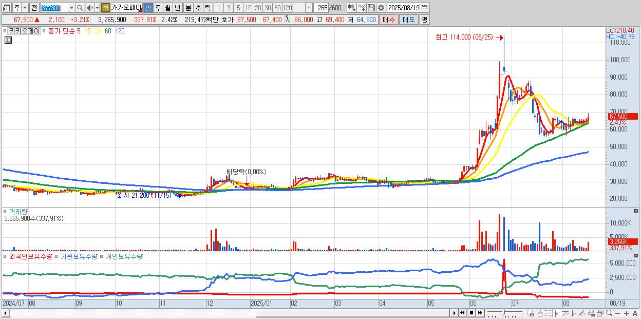 - 카카오페이 (67,500원 ▲ 3.21% , 시총: 91,175억, 거래량: 1,814,653, 거래대금:1,220억)