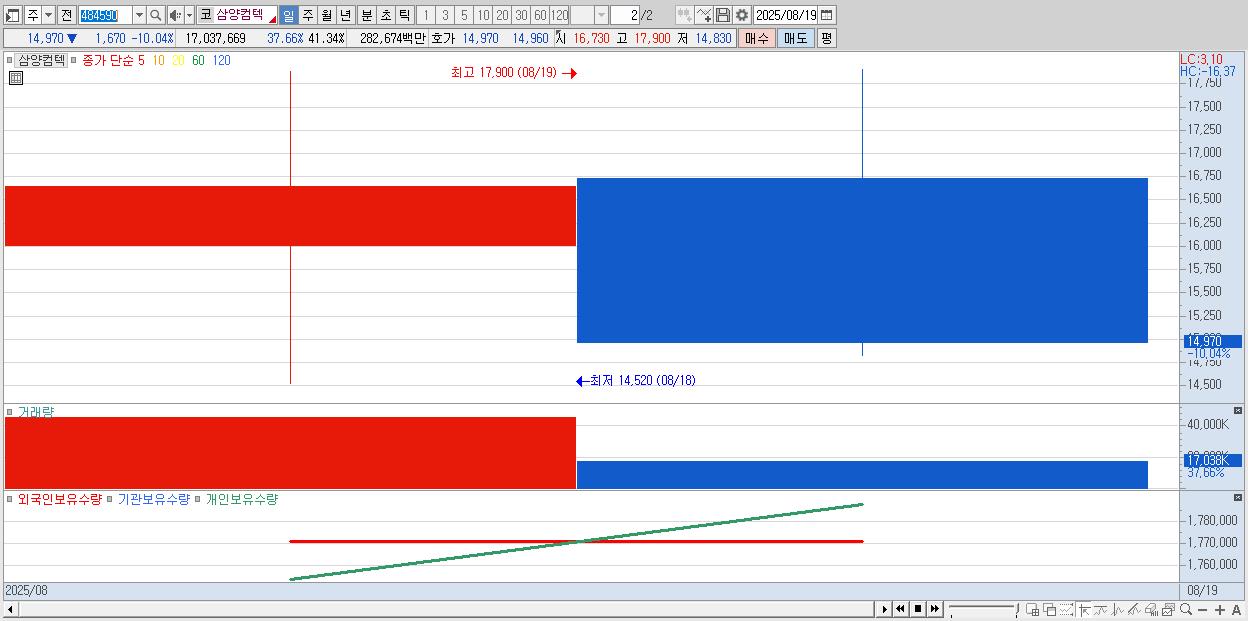 - 삼양컴텍 (15,100원 ▼ -9.25% , 시총: 6,223억, 거래량: 8,404,461, 거래대금:1,393억)