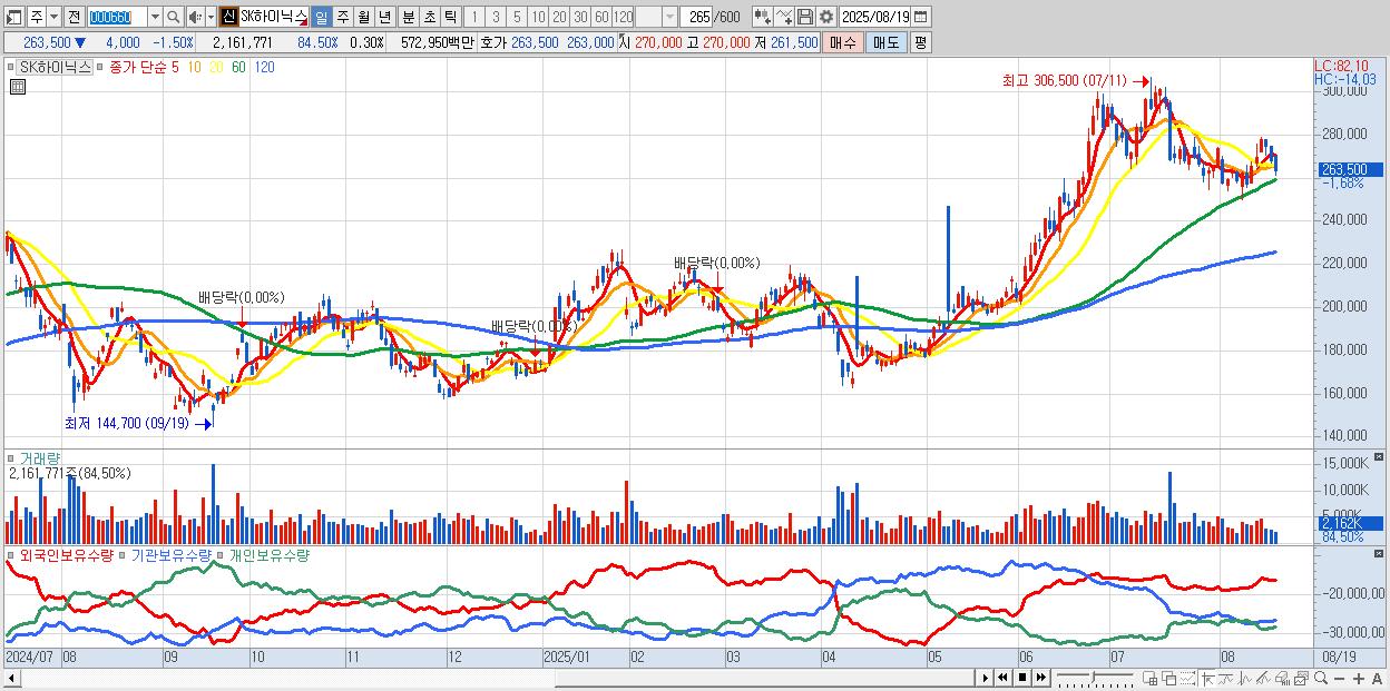 - SK하이닉스 (263,000원 ▼ -1.68% , 시총: 1,914,646억, 거래량: 1,709,646, 거래대금:4,529억)