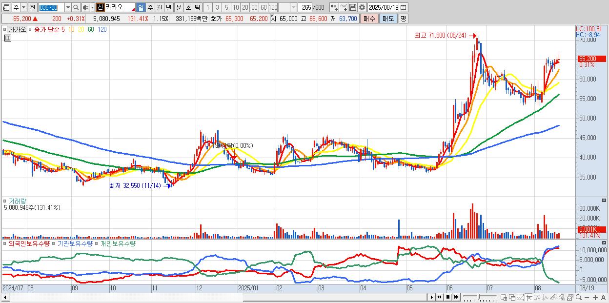 - 카카오 (65,200원 ▲ 0.31% , 시총: 288,265억, 거래량: 2,712,501, 거래대금:1,768억)