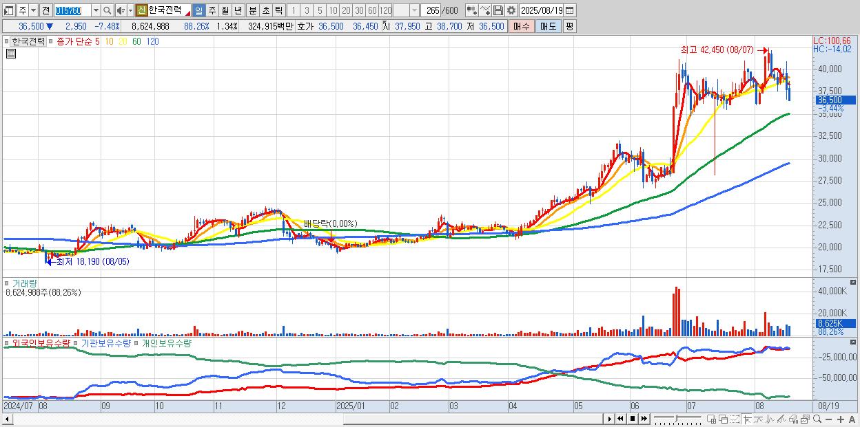 - 한국전력 (37,350원 ▼ -5.32% , 시총: 239,774억, 거래량: 5,167,793, 거래대금:1,948억)