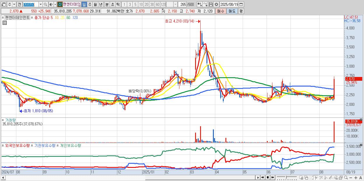 - 팬엔터테인먼트 (2,670원 ▲ 25.94% , 시총: 739억, 거래량: 35,810,205, 거래대금:911억)