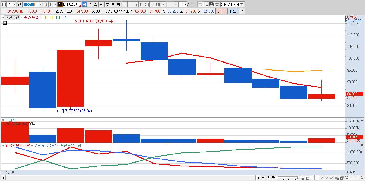 - 대한조선 (84,800원 ▲ 1.31% , 시총: 32,670억, 거래량: 1,199,580, 거래대금:1,051억)