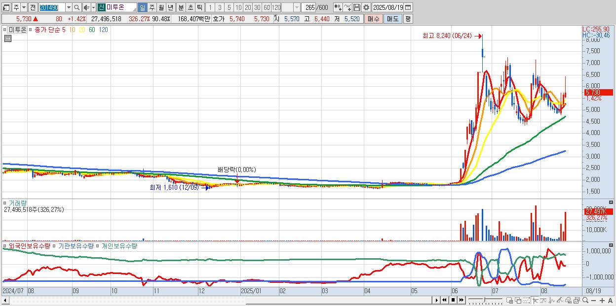 - 미투온 (5,730원 ▲ 1.42% , 시총: 1,741억, 거래량: 27,496,518, 거래대금:1,684억)