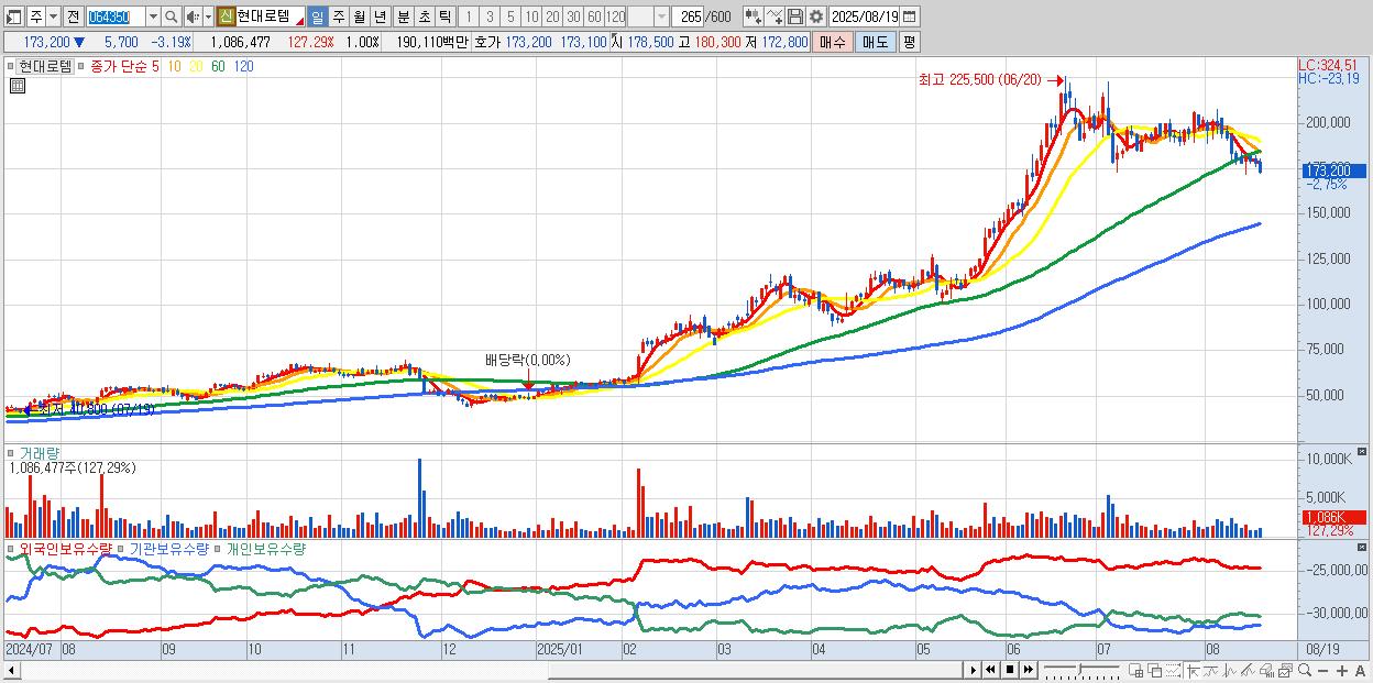 - 현대로템 (174,200원 ▼ -2.63% , 시총: 190,126억, 거래량: 795,282, 거래대금:1,391억)