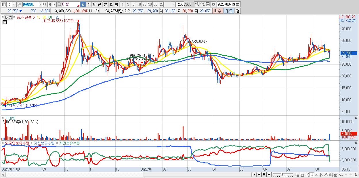 - 태성 (30,400원 0% , 시총: 9,272억, 거래량: 3,127,028, 거래대금:866억)