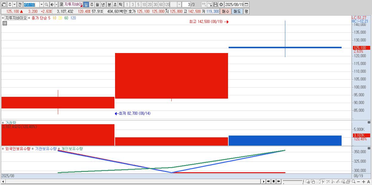 - 지투지바이오 (126,300원 ▲ 3.61% , 시총: 6,777억, 거래량: 1,432,372, 거래대금:1,874억)