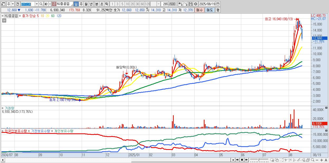 - HJ중공업 (12,660원 ▼ -11.78% , 시총: 10,543억, 거래량: 6,930,340, 거래대금:913억)