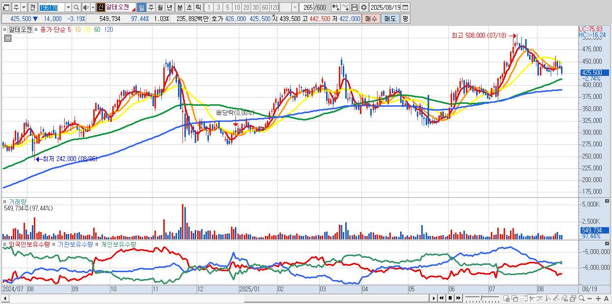 - 알테오젠 (427,000원 ▼ -2.84% , 시총: 228,295억, 거래량: 341,276, 거래대금:1,463억)