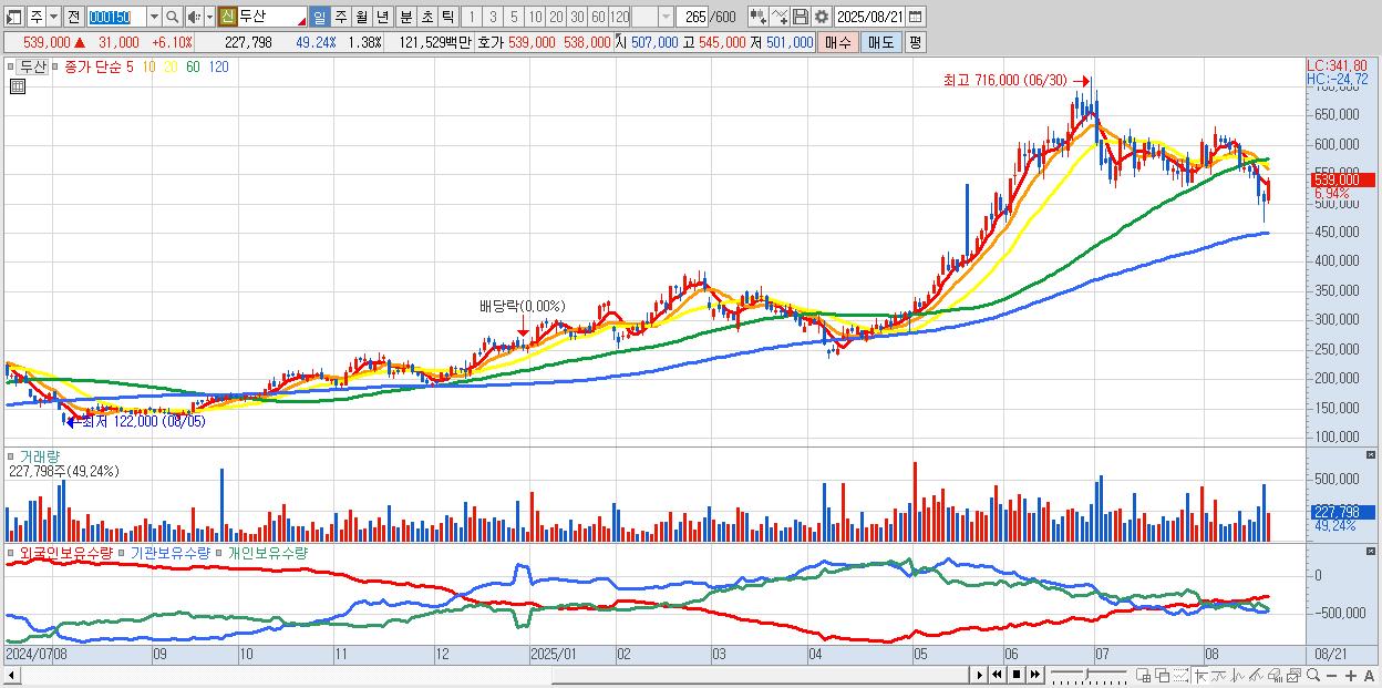 - 두산 (540,000원 ▲ 6.3% , 시총: 89,229억, 외국인 순매수 거래금:81억)