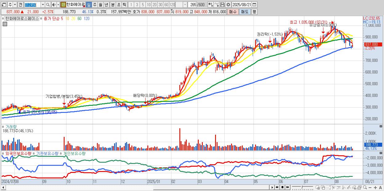 - 한화에어로스페이스 (834,000원 ▲ 2.21% , 시총: 430,039억, 외국인 순매수 거래금:58억)