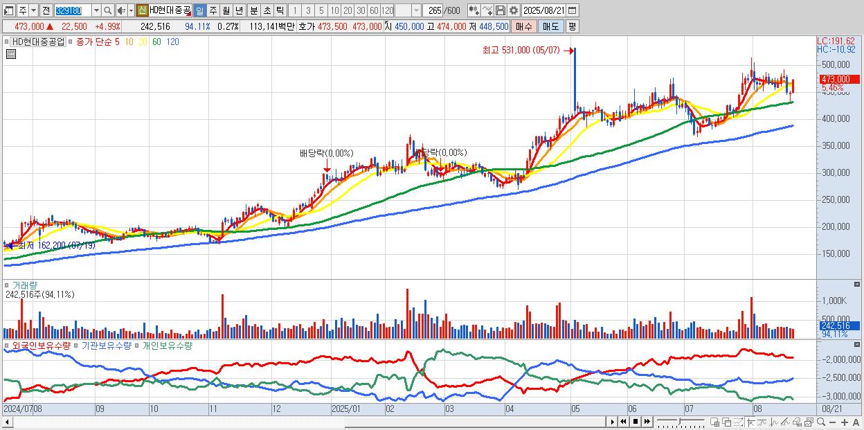 - HD현대중공업 (472,000원 ▲ 4.77% , 시총: 419,009억, 외국인 순매수 거래금:64억)