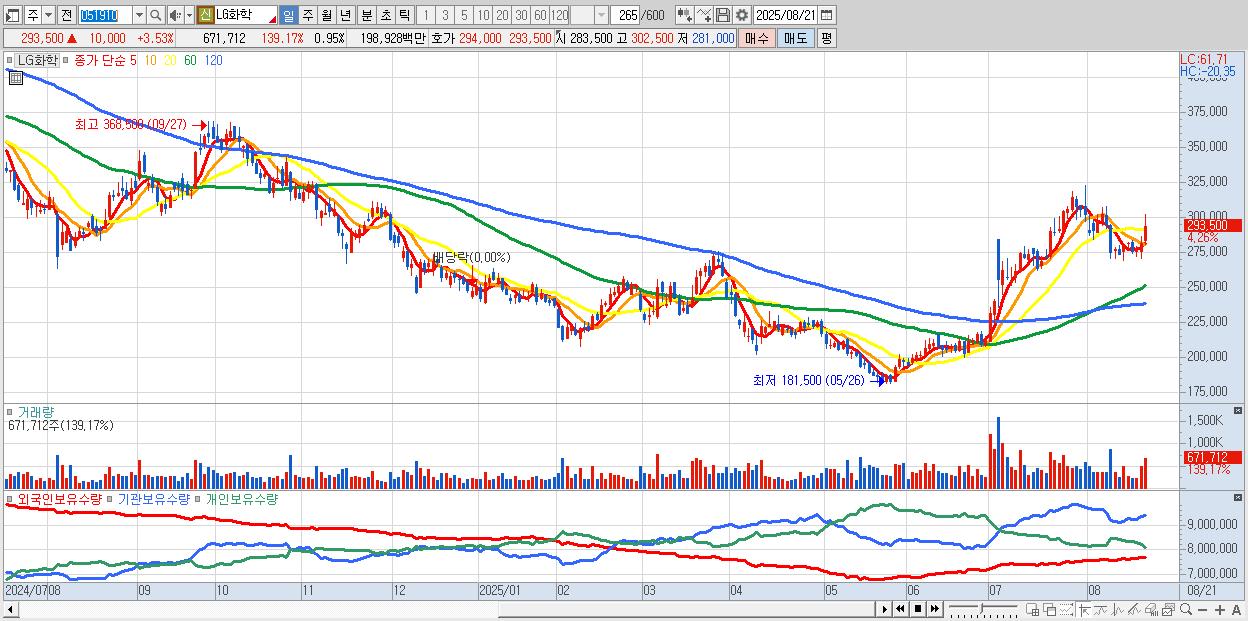 - LG화학 (293,000원 ▲ 3.35% , 시총: 206,836억, 외국인 순매수 거래금:341억)