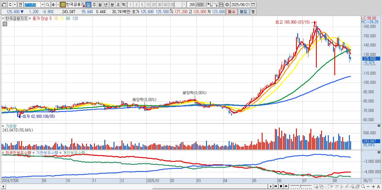 - 한국금융지주 (125,300원 ▼ -1.18% , 시총: 69,825억, 외국인 순매수 거래금:59억)
