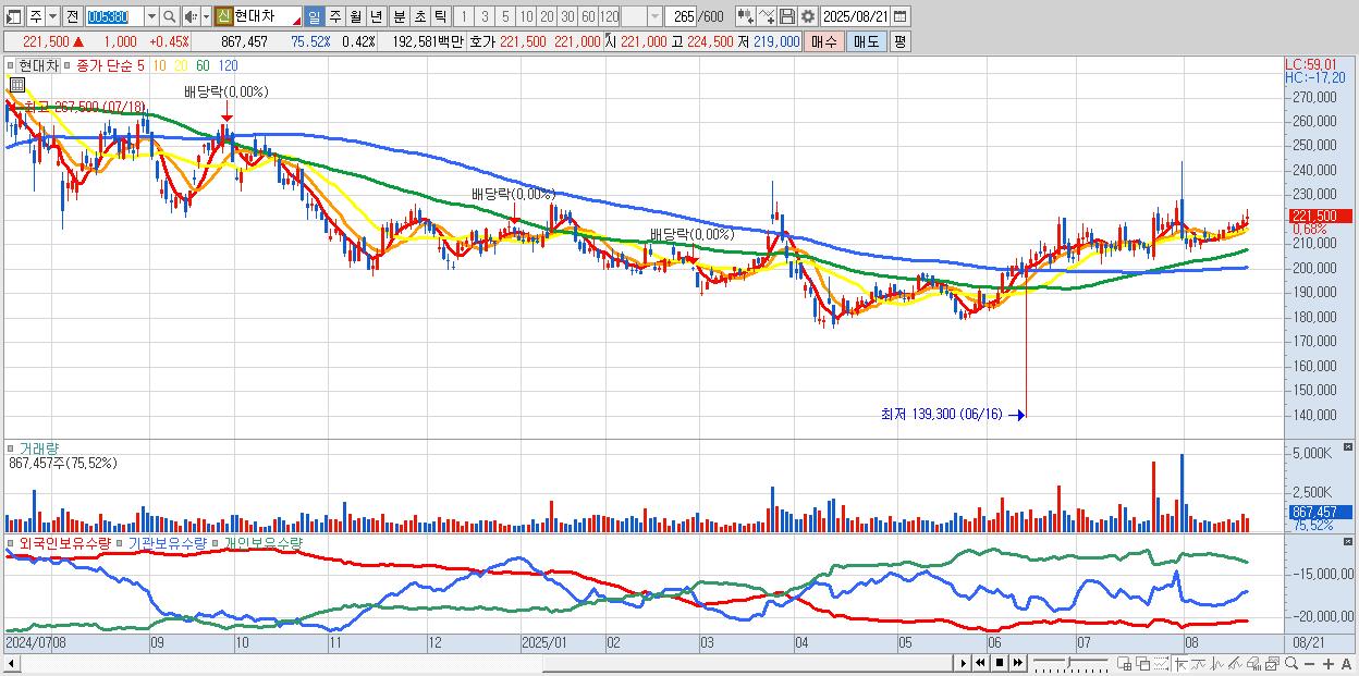 - 현대차 (221,500원 ▲ 0.45% , 시총: 453,538억, 외국인 순매수 거래금:267억)