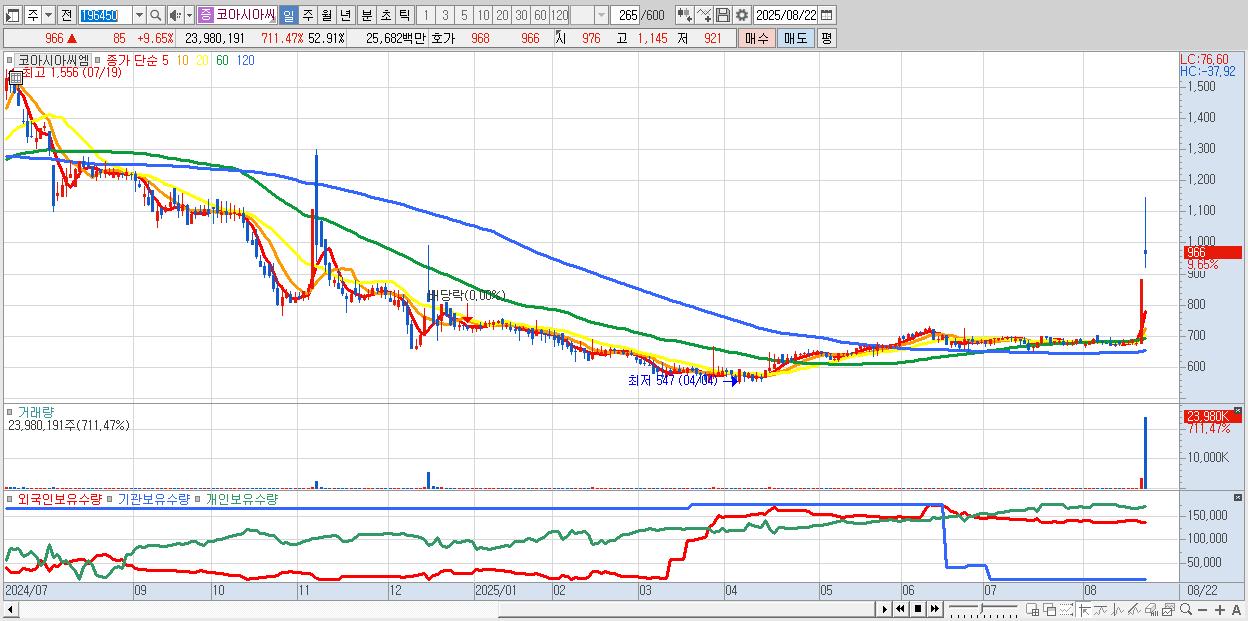 - 코아시아씨엠 (966원 ▲ 9.65% , 시총: 438억, 거래량: 23,980,191, 거래대금:257억)