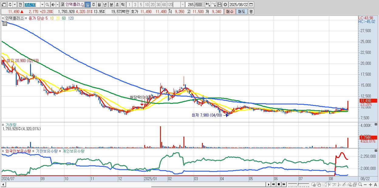 - 인텍플러스 (11,490원 ▲ 23.28% , 시총: 1,478억, 거래량: 1,793,928, 거래대금:196억)