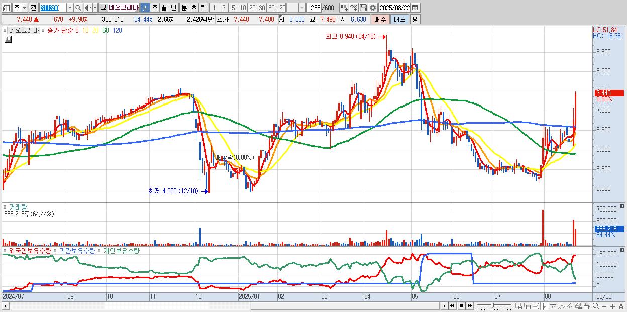 - 네오크레마 (7,440원 ▲ 9.9% , 시총: 941억, 거래량: 336,216, 거래대금:24억)