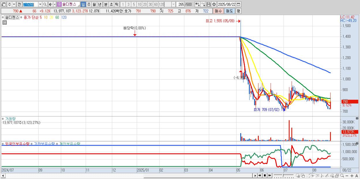 - 솔디펜스 (790원 ▲ 9.12% , 시총: 915억, 거래량: 13,977,107, 거래대금:114억)