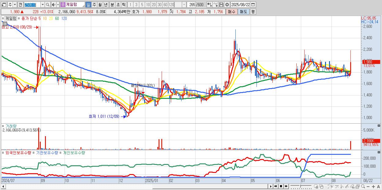 - 케일럼 (1,980원 ▲ 13.01% , 시총: 530억, 거래량: 2,166,060, 거래대금:44억)