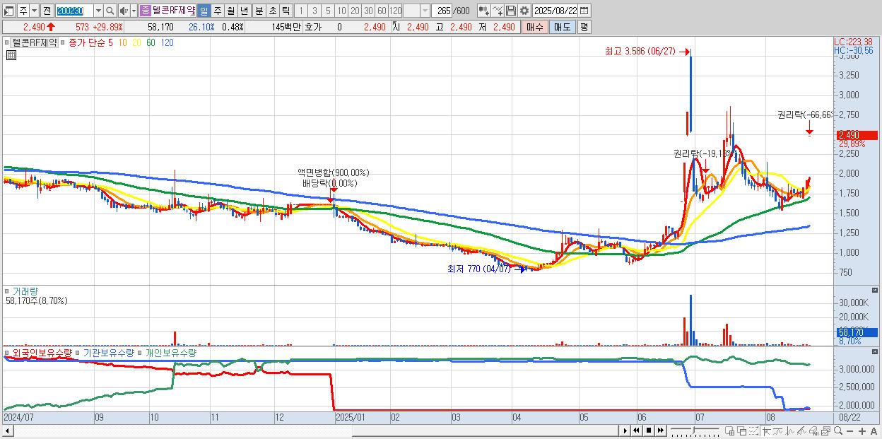 - 텔콘RF제약 (2,490원 ▲ 29.89% , 시총: 299억, 거래량: 58,170, 거래대금:1억)
