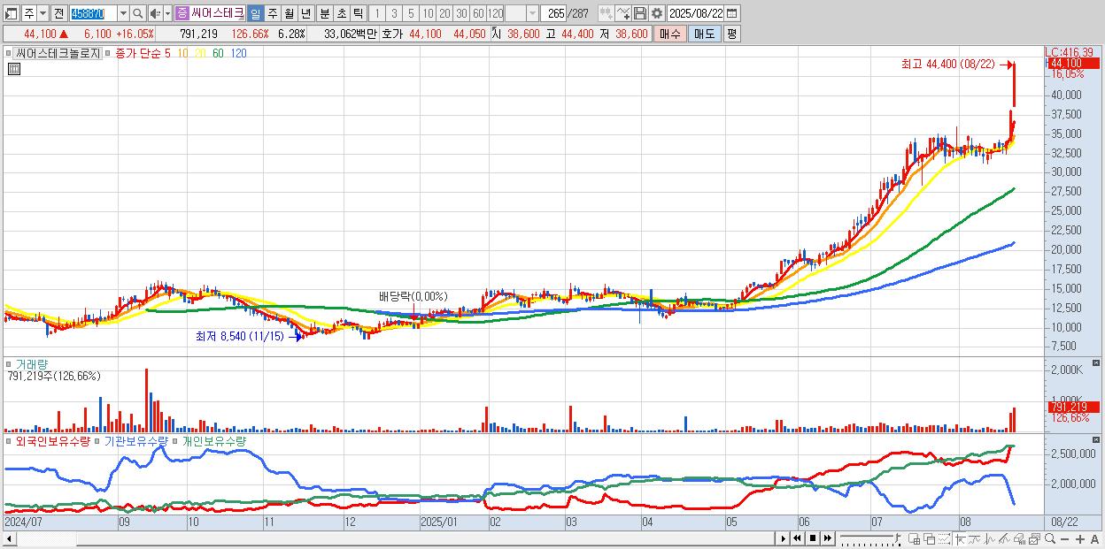 - 씨어스테크놀로지 (44,100원 ▲ 16.05% , 시총: 5,553억, 거래량: 791,219, 거래대금:331억)
