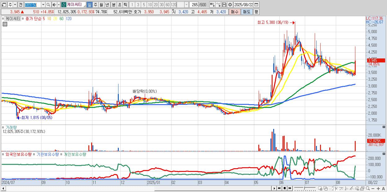 - 케이씨티 (3,945원 ▲ 14.85% , 시총: 677억, 거래량: 12,825,305, 거래대금:526억)