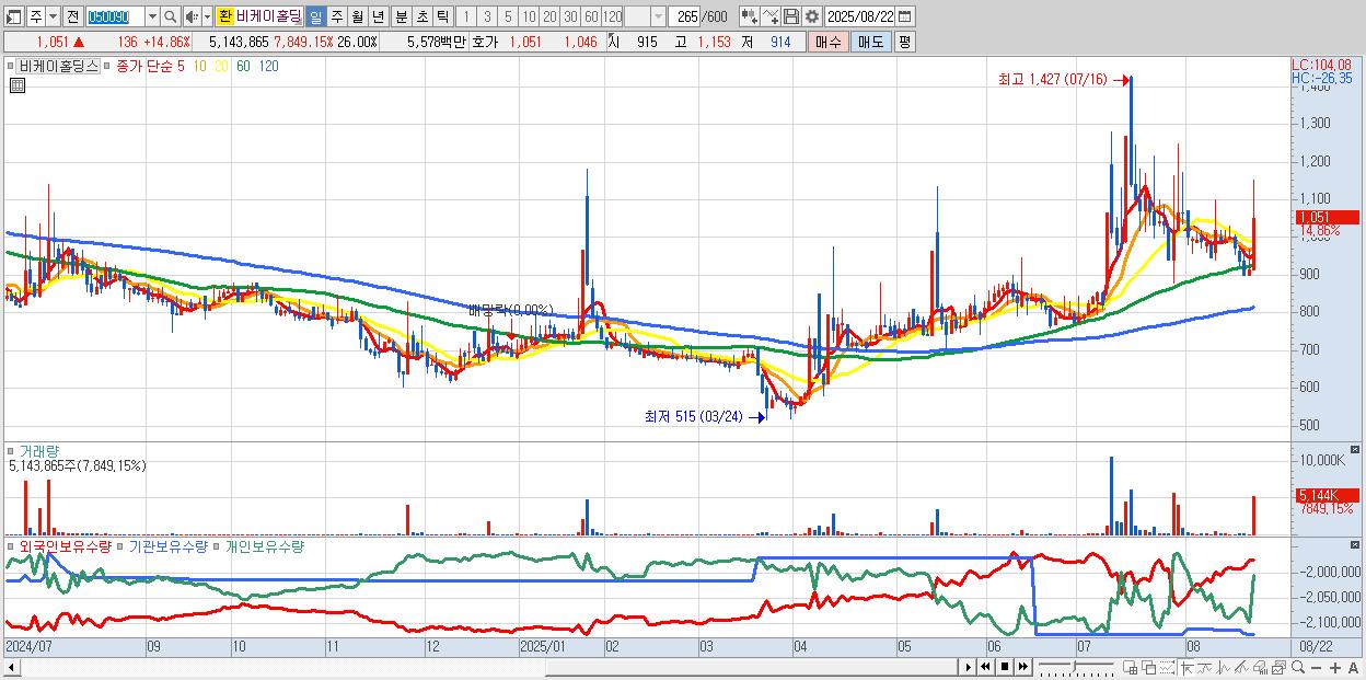 - 비케이홀딩스 (1,051원 ▲ 14.86% , 시총: 208억, 거래량: 5,143,865, 거래대금:56억)