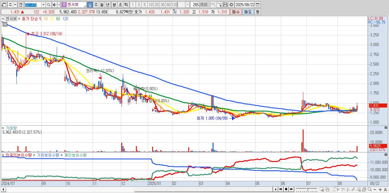 - 센서뷰 (1,431원 ▲ 9.32% , 시총: 625억, 거래량: 5,962,483, 거래대금:86억)