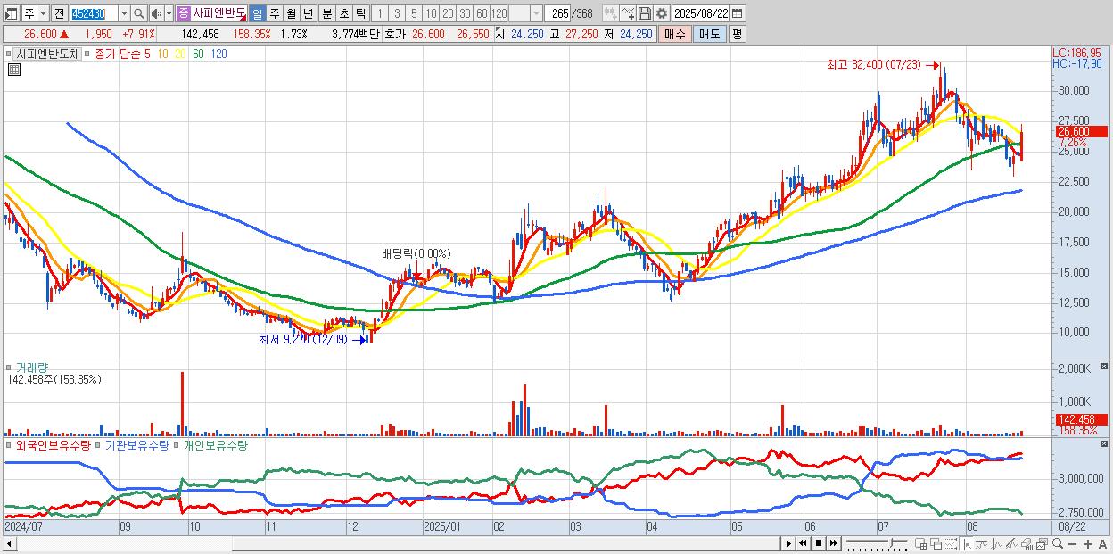 - 사피엔반도체 (26,800원 ▲ 8.72% , 시총: 2,201억, 거래량: 85,607, 거래대금:23억)