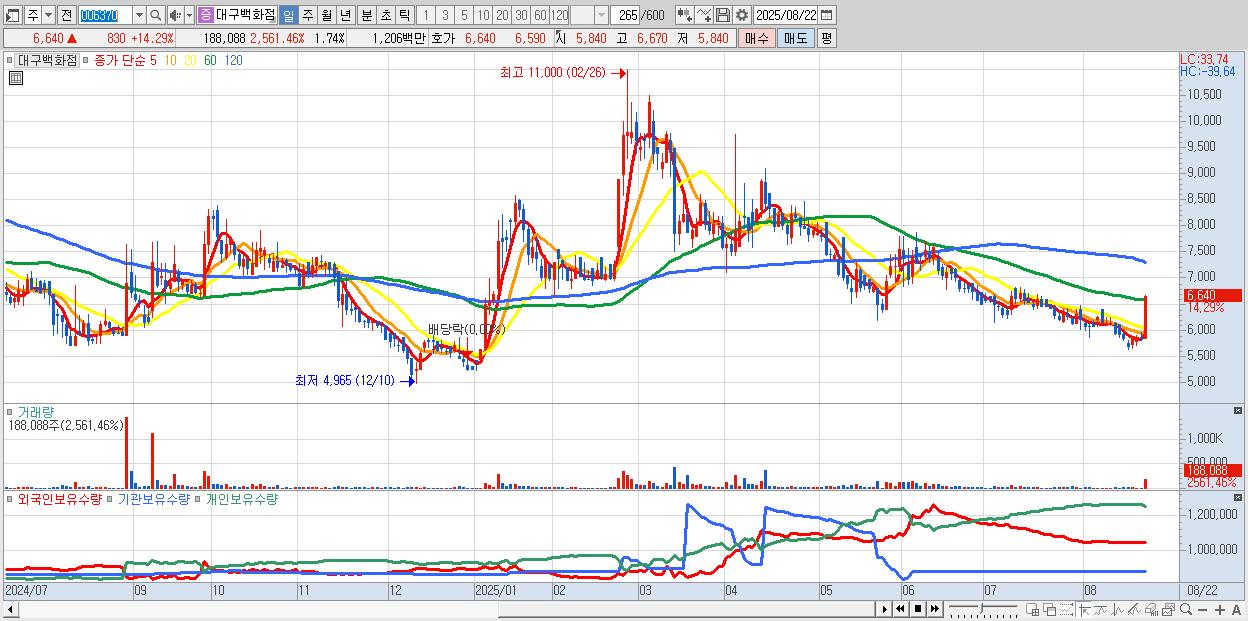 - 대구백화점 (6,640원 ▲ 14.29% , 시총: 719억, 거래량: 188,088, 거래대금:12억)
