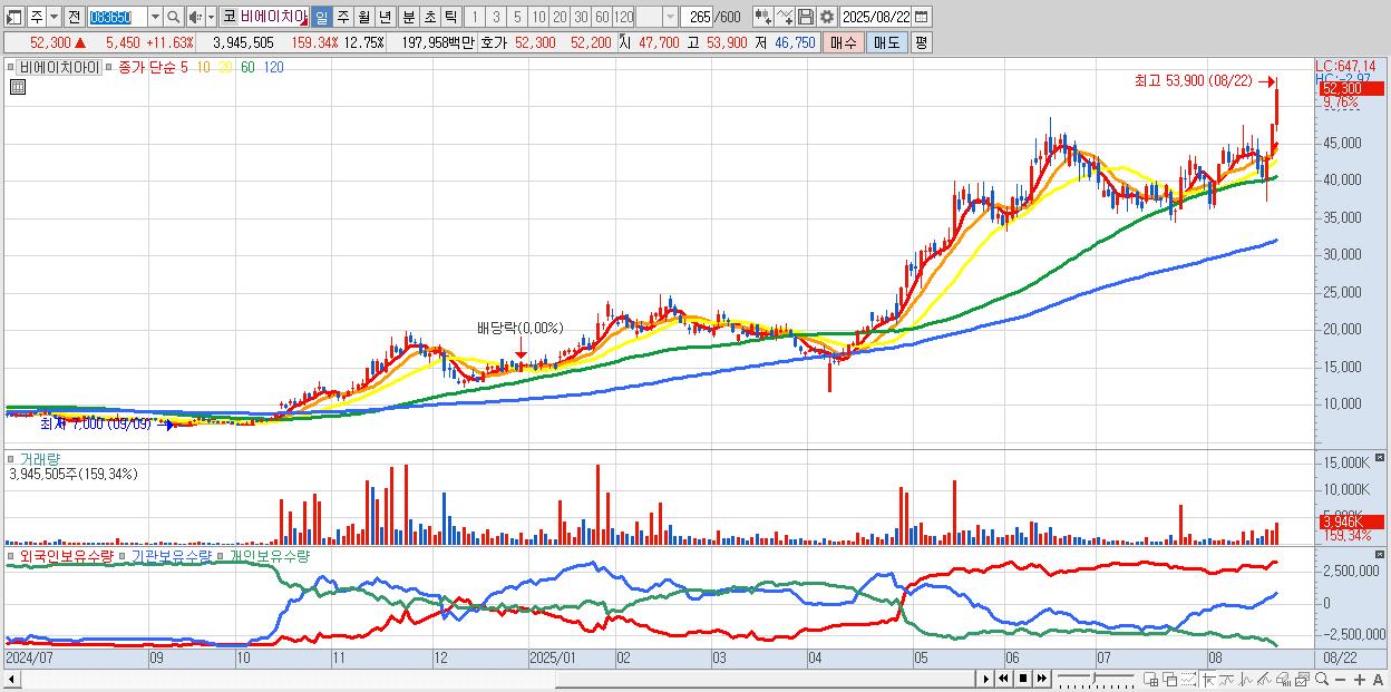 - 비에이치아이 (51,900원 ▲ 10.78% , 시총: 16,060억, 거래량: 1,773,675, 거래대금:886억)
