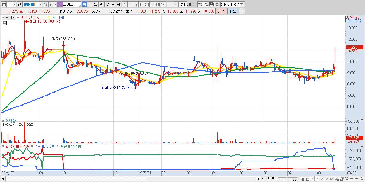 - 코아스 (11,270원 ▲ 14.53% , 시총: 371억, 거래량: 173,575, 거래대금:19억)
