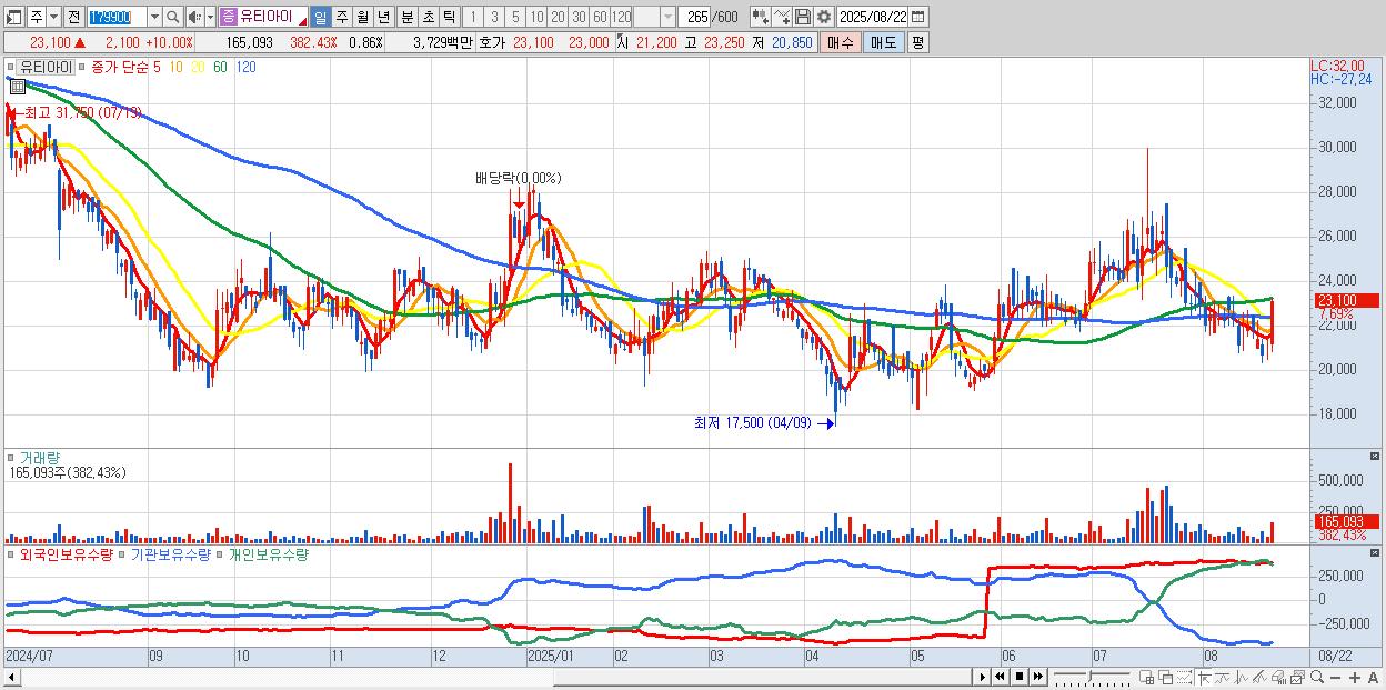 - 유티아이 (23,100원 ▲ 10% , 시총: 4,437억, 거래량: 120,794, 거래대금:27억)