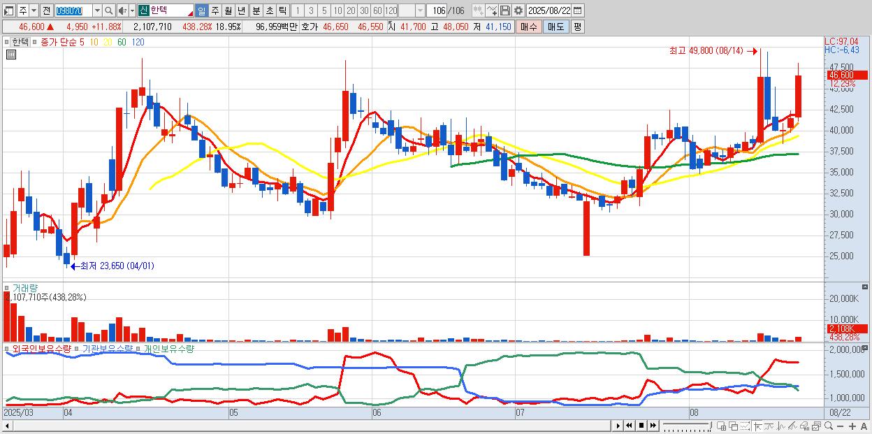 - 한텍 (46,900원 ▲ 12.61% , 시총: 5,216억, 거래량: 1,148,049, 거래대금:528억)
