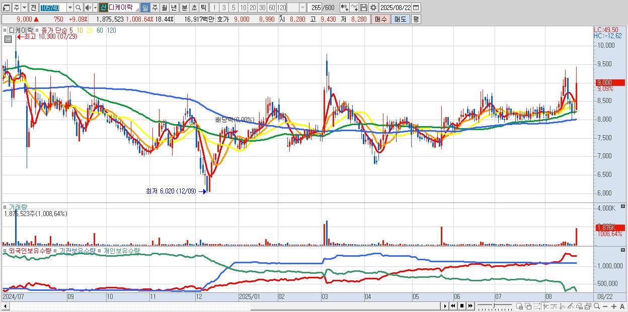 - 디케이락 (9,000원 ▲ 9.09% , 시총: 915억, 거래량: 1,875,523, 거래대금:169억)