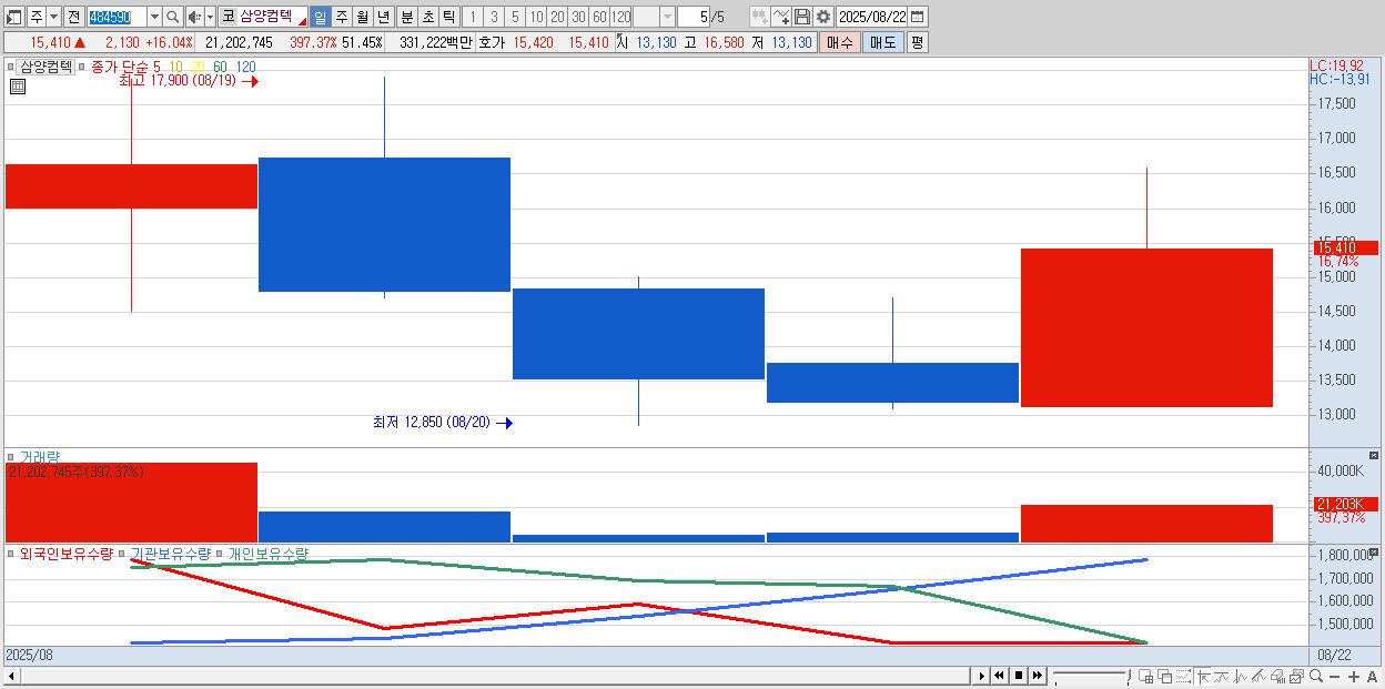- 삼양컴텍 (15,270원 ▲ 14.98% , 시총: 6,293억, 거래량: 10,980,723, 거래대금:1,723억)