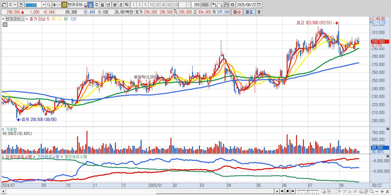 - 현대모비스 (299,500원 ▲ 0.67% , 시총: 274,926억, 외국인 순매수 거래금:70억)
