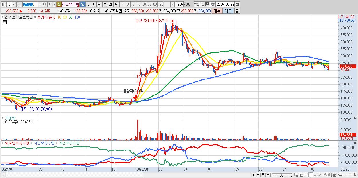 - 레인보우로보틱스 (263,000원 ▲ 3.54% , 시총: 51,022억, 외국인 순매수 거래금:74억)