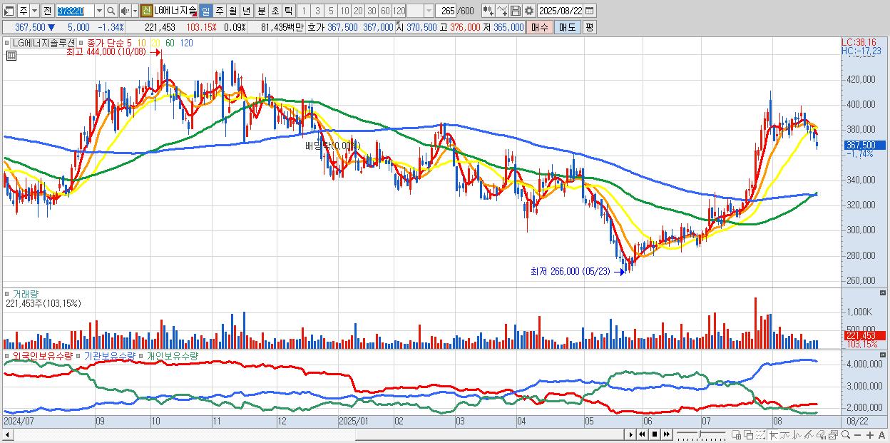 - LG에너지솔루션 (367,500원 ▼ -1.34% , 시총: 859,950억, 외국인 순매수 거래금:111억)