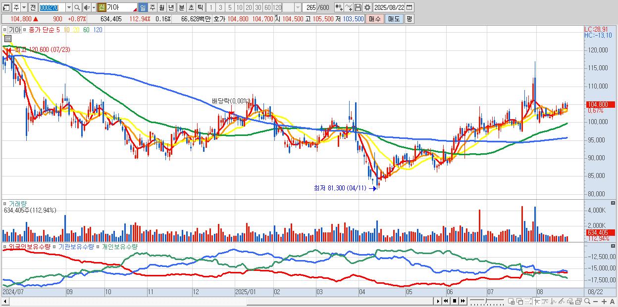 - 기아 (104,800원 ▲ 0.87% , 시총: 416,761억, 외국인 순매수 거래금:249억)