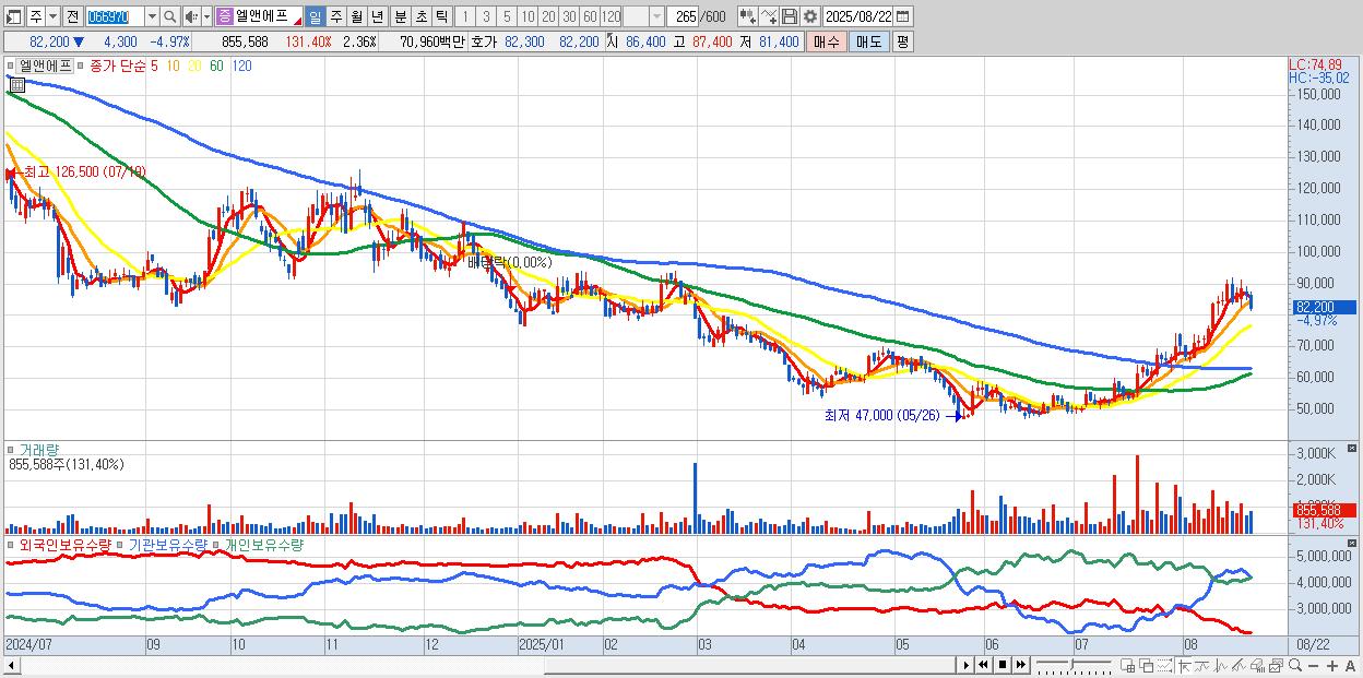 - 엘앤에프 (82,500원 ▼ -4.62% , 시총: 29,961억, 외국인 순매수 거래금:66억)