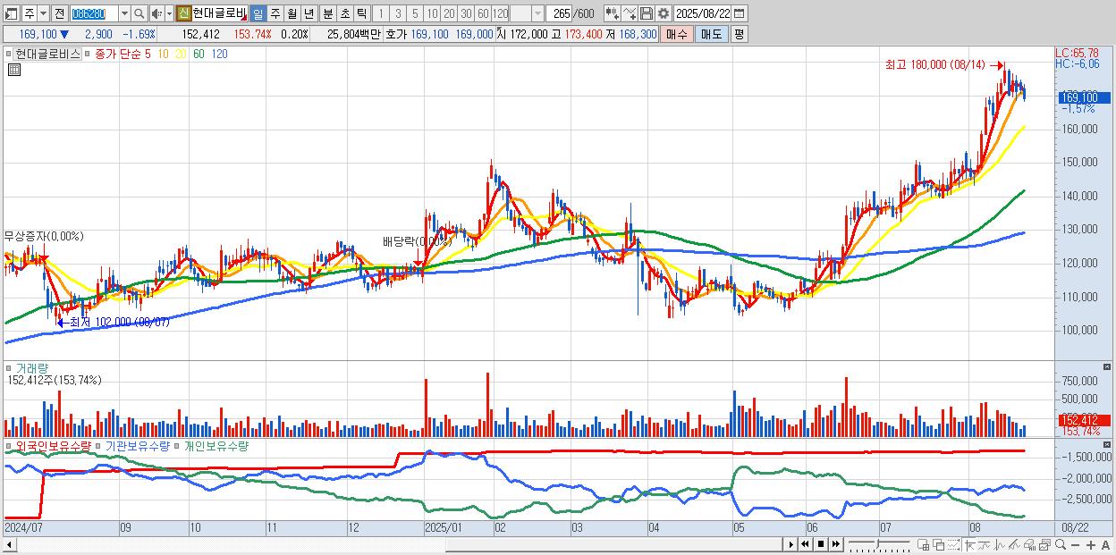 - 현대글로비스 (169,100원 ▼ -1.69% , 시총: 126,825억, 외국인 순매수 거래금:63억)