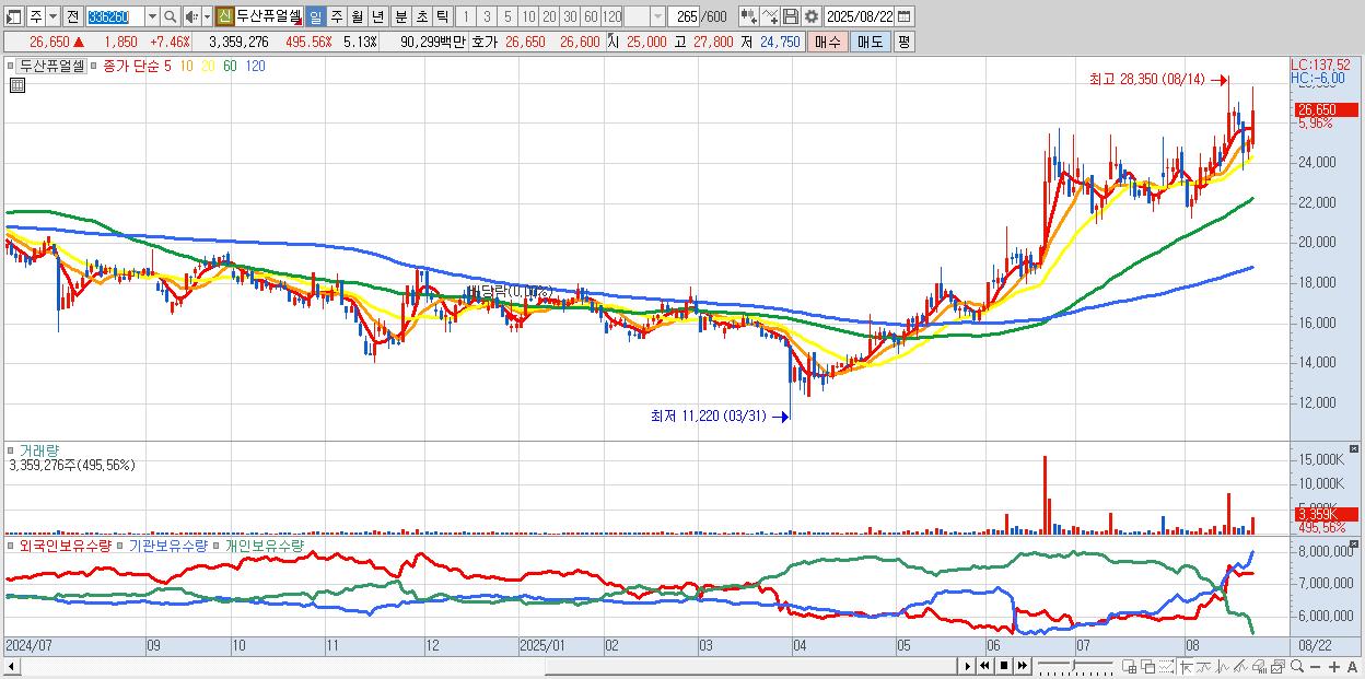 - 두산퓨얼셀 (26,400원 ▲ 6.45% , 시총: 17,290억, 외국인 순매수 거래금:66억)