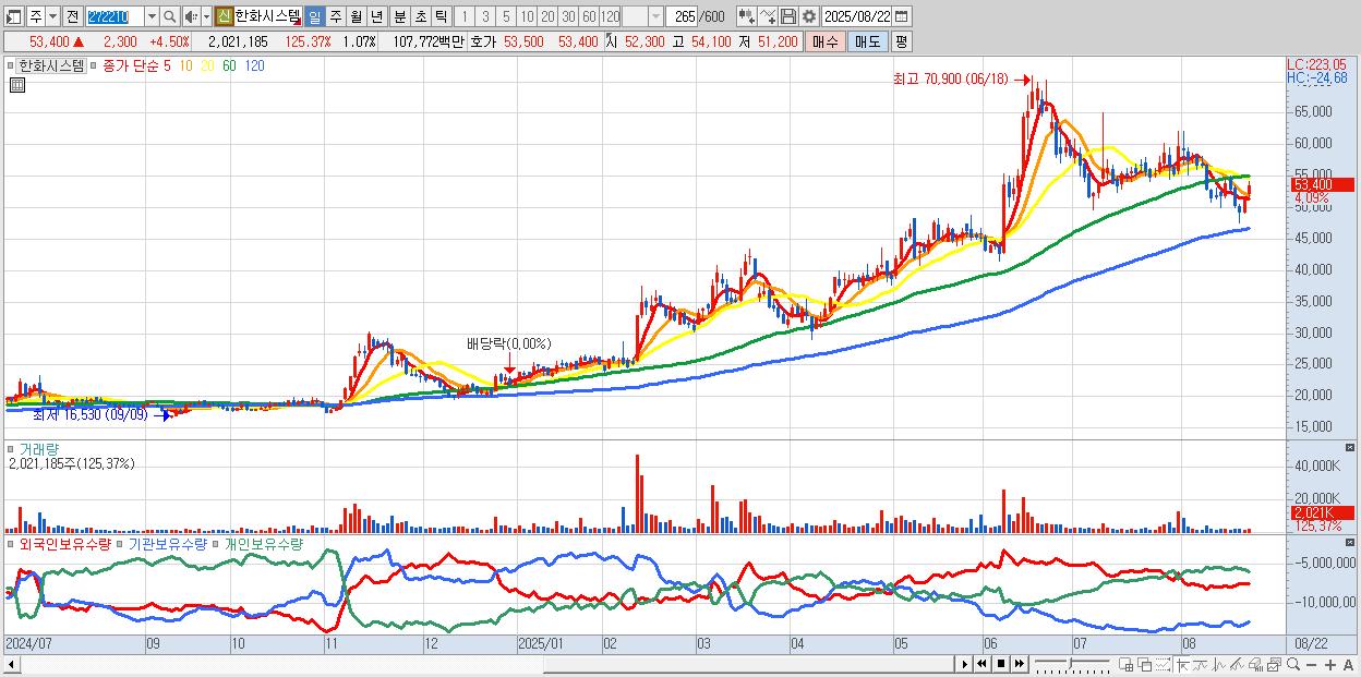 - 한화시스템 (53,300원 ▲ 4.31% , 시총: 100,694억, 외국인 순매수 거래금:130억)