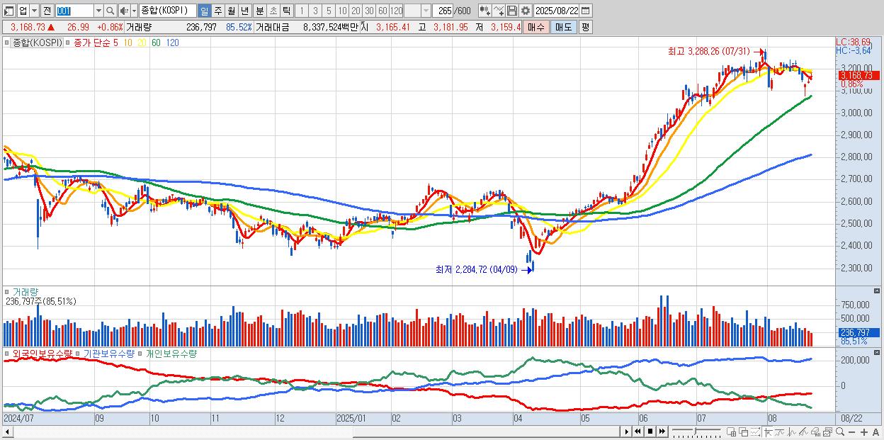 | 08/22 | 3,168.73 | ▲0.86% | -4,572억 | 1,826억 | 1,556억 | 1,190억 |