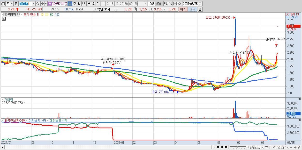 - 텔콘RF제약 (3,235원 ▲ 29.92% , 시총: 389억, 거래량: 29,529, 거래대금:1억)